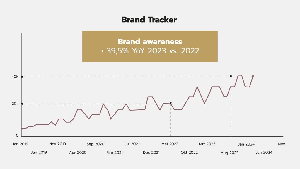 Waarom investeren in brand awareness als de omzet toch al goed gaat? Simpel. Fashion en retail zijn sterk concurrentiële markten. Met advertentiebudgetten kan je adverteren en je collecties verkopen, maar dat betekent nog niet dat je het eerste merk bent waaraan je doelgroep denkt voor een nieuwe outfit. Uit ons onderzoek bleek dat er aan die top of mind awareness best nog wat kon worden gewerkt. We besloten om niet alleen meer te pushen op producten, maar ook om het verhaal rond Les Soeurs te verspreiden. Daar zijn we in het laatste kwartaal van afgelopen jaar sterk op beginnen inzetten met advertenties op social media. De share of voice groeit hierdoor stelselmatig, met een duidelijke piek na onze inspanningen vanaf 2023.