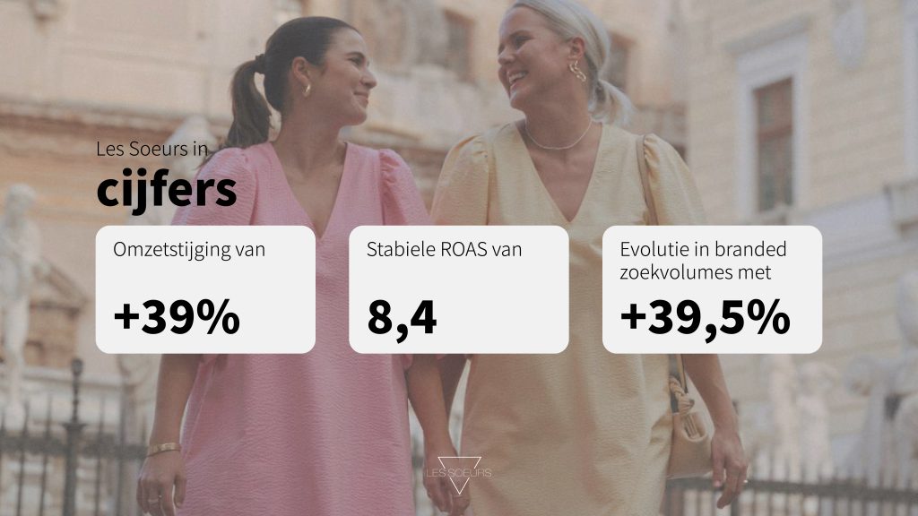 Fashion, dat is een branding op zich. Je toont ermee wie je bent en waar je voor staat. En laat dat nu net precies passen in het digitale traject van mode- en accessoirelabel Les Soeurs: een online en offline positie innemen tussen de duurdere boetieks en betaalbare modeketens. Onze samenwerking in 2023 stond in het teken van omzet verhogen. Dat deden we goed, met een online omzet van +39% en een ROAS van 8,4. Die koers zetten we dit jaar verder, maar om die positionering nog scherper te stellen, richten we onze pijlen extra op brand awareness.