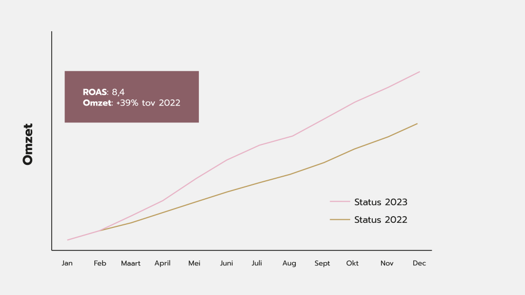 In 2023 lieten we de online omzet stijgen met 39% ten opzichte van het jaar ervoor. Daarvoor zetten we de salesactivatie op scherp. Zo stroomlijnden we het salesproces van de webshop volgens de CRO-, SEO- en UX-regels. Voor de online advertenties deden we beroep op de juiste performancekanalen, formats en creatives. Na een jarenlange samenwerking met Les Soeurs weten we voor elk kanaal goed welke advertenties werken en welke niet. Onze geoptimaliseerde aanpak werkt, want de ROAS bleef gelijk met 8,4. Een sterk cijfer, zeker als je weet dat we aan het begin van de samenwerking mikten op een ROAS tussen de 4 en de 7. Verder begonnen we in te spelen op brand awareness, waar we extra in hebben geïnvesteerd.