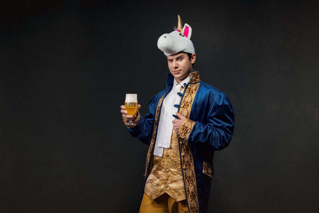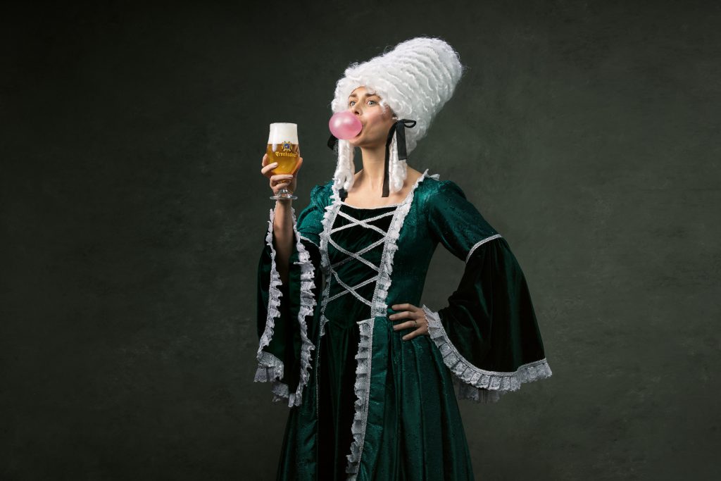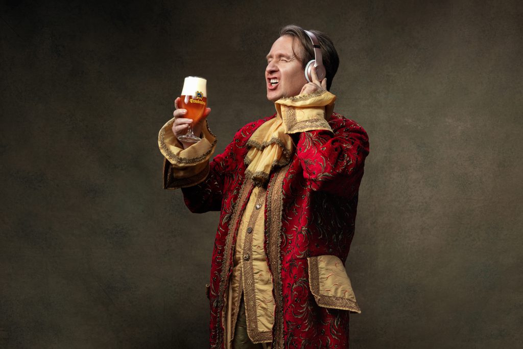 Zo kwamen we uit bij zijn tijd vooruit. Meteen een perfecte kapstok om de andere facetten van de campagne rond op te bouwen. Om een bijpassend beeld te vinden, hoefden we niet ver te zoeken. Een bier dat Troubadour heet, vraagt nog net niet om in beeld gebracht te worden met – je raadt het al – een troubadour! De grappige stadsgek zouden we ten tonele laten treden in zijn klassieke klederdracht, gecombineerd met een typisch eigentijds voorwerp in de hand, op het hoofd of aan de voeten. Door de combinatie van beide, hoopten we de bijpassende baseline helemaal tot leven te brengen in verrassend foto- en videomateriaal.