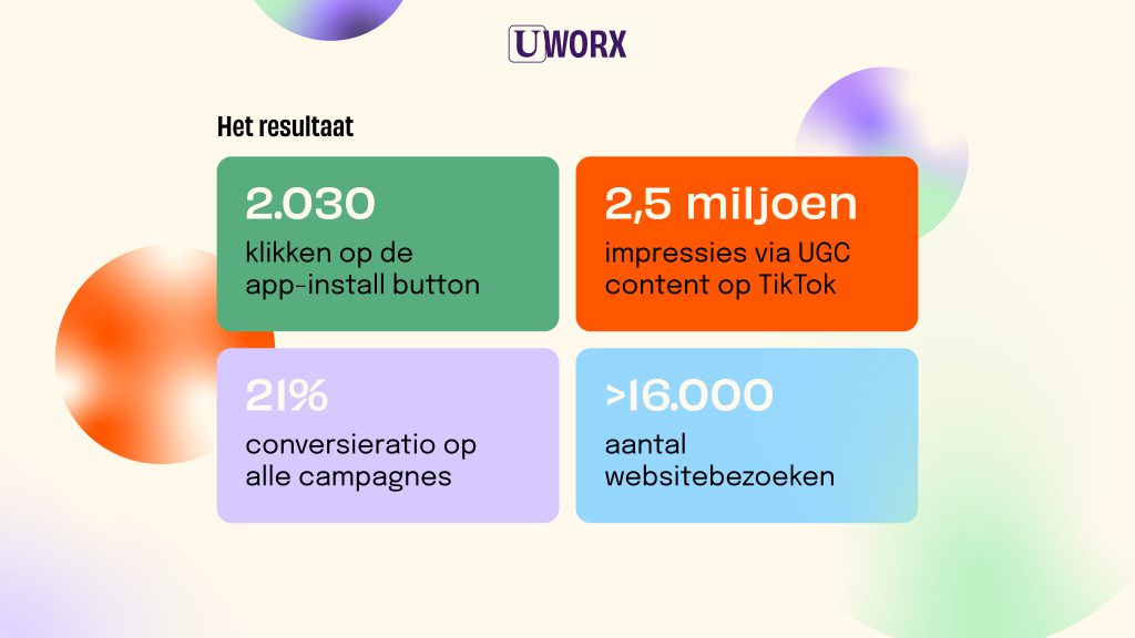 Een go to market-strategie bedenken is één ding. Wat een agency écht onderscheidt, is de opvolging van begin tot einde. Daarom deed OMcollective voor Uworx zowel de creatieve concepting en vormgeving, het faciliteren van de uitrol en de verspreiding van content (ook user generated) als advertenties op Google Ads (Perfomance Max en app-install campagnes) en sociale media.